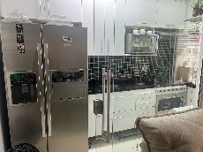 Cozinha americana com armários e divisória de blindex para área de serviço.