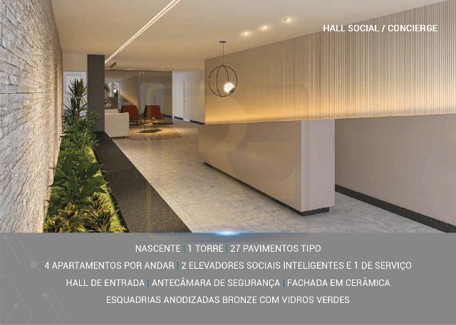 Torre única, nascente, fachada em cerâmica, esquadrias bronze com vidros verdes, elevadores inteligentes e antecâmara de segurança.