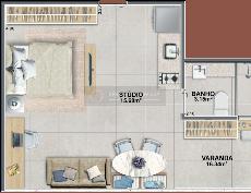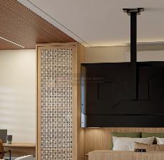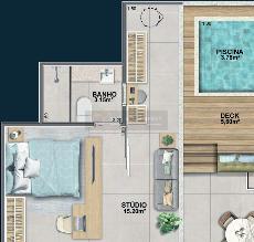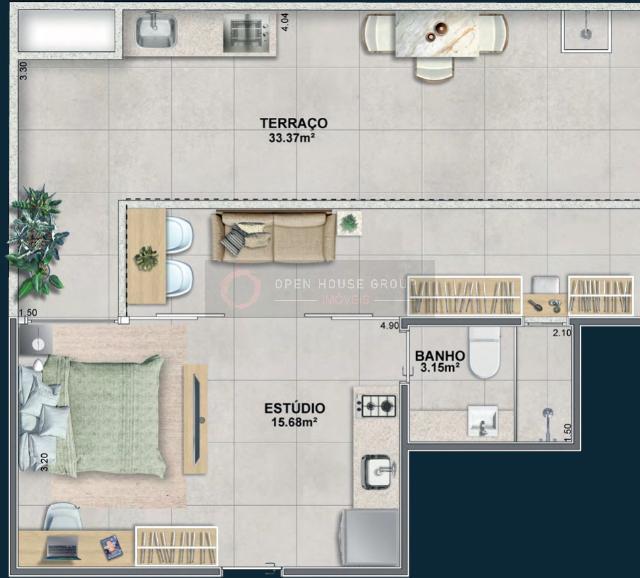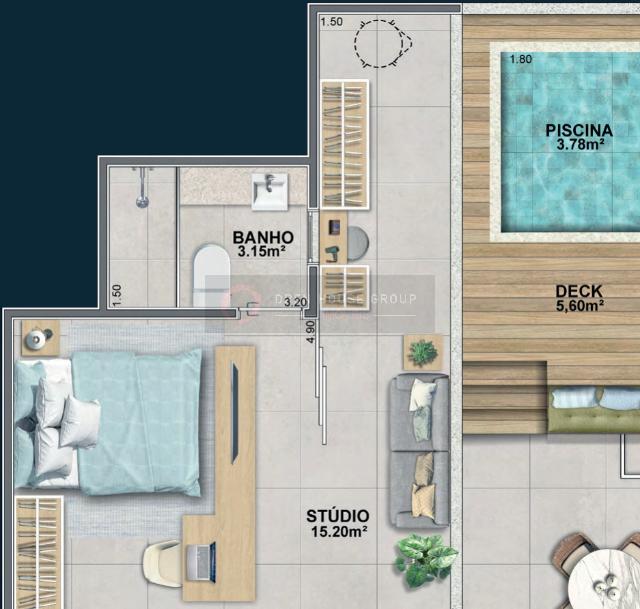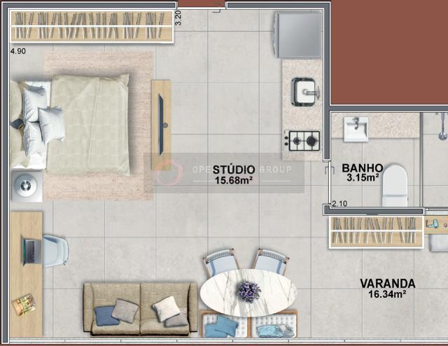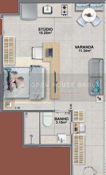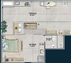 Piso nivelado e contínuo entre o studio e a varanda mais amplitude, integração e elegância.