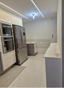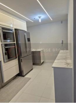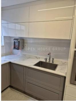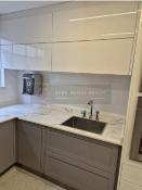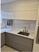 Cozinha com armários planejados em laca e bancada em dekton