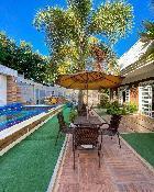 A mansão possui uma área de lazer com Piscina -