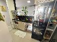 A cozinha americana com balcão e espaço para área de serviço.